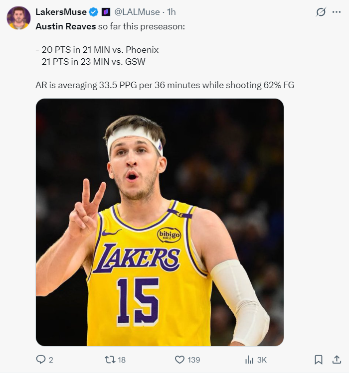里夫斯21+3小腿被撞:雷迪克称情况还行 湖媒晒两战41分状态神勇